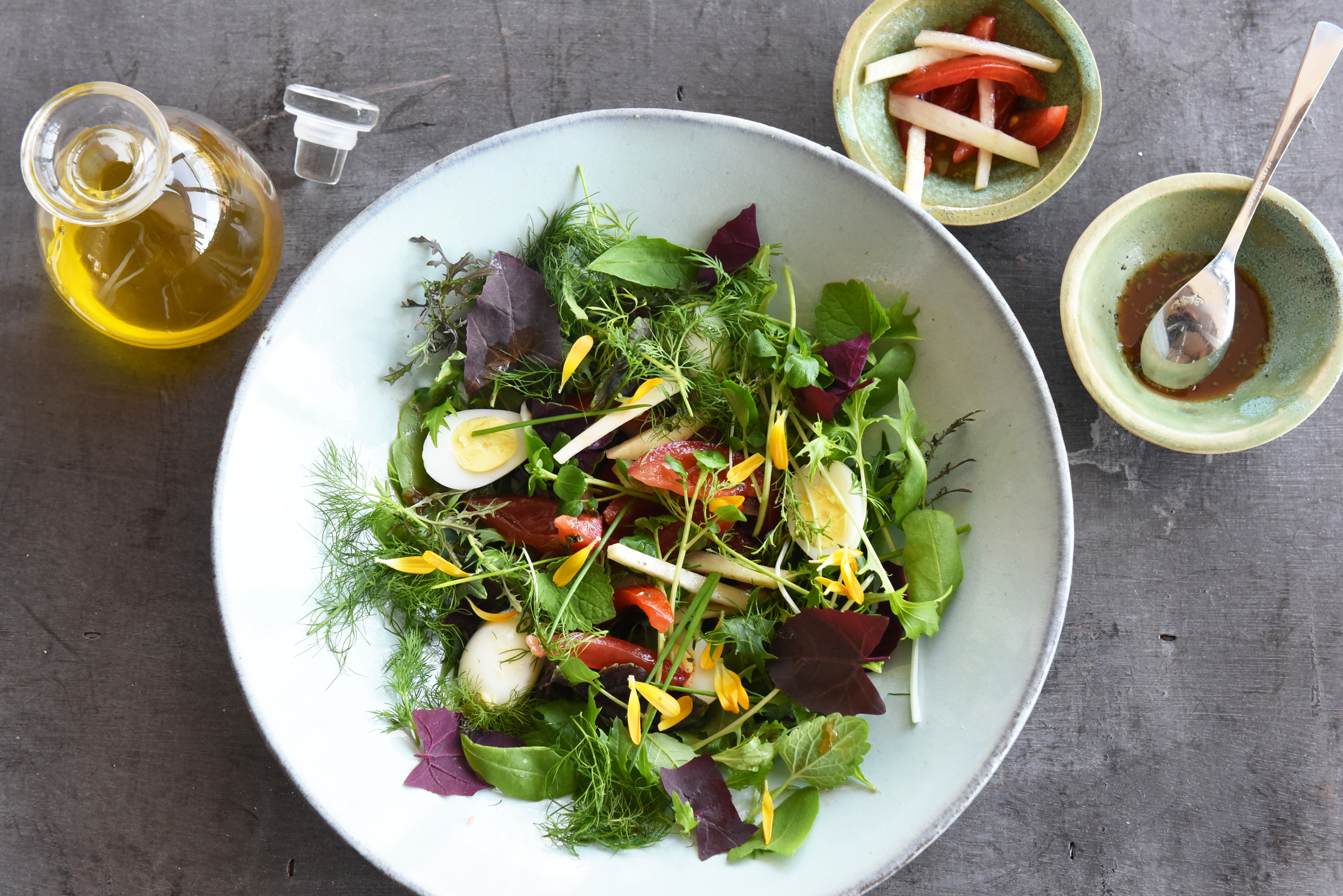 – Meng alle kruiden door elkaar, hussel er een deel van de tomaat/koolrabi door, verdeel er de kwarteleitjes over, besprenkel met wat vinaigrette – geef de rest er apart bij – en werk af met bieslook, waterkers en calendulabloemenblaadjes.