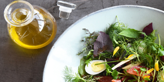 Voor een kruidensalade kun je echt alle kruiden die je lekker vindt, mengen. Mitzuma is weldegelijk een kruid en zorgt met zijn stevige blad en beet voor de krokante basis. Zachtere kruiden van textuur zijn een mooie smaakaanvulling. Omdat er ook tomaat in gaat, is basilicum een mooie extra. Wel zuinig mee zijn, vooral de Griekse smaakt pittig door. Olijfkruid – niet iedereen houdt van olijven – zorgt voor de zuiderse toets op een zachte manier. De gele bloemblaadjes van calendula, de uiige bieslook en de peperige waterkers ronden de salade mooi af. De koolrabi geeft extra beet en de kwarteleitjes geven mee kleur.