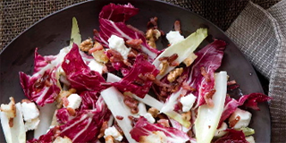 – Meng de radicchio en het witloof en leg op de borden. Verdeel er de kaas, spekjes en walnoten over en besprenkel met vinaigrette.