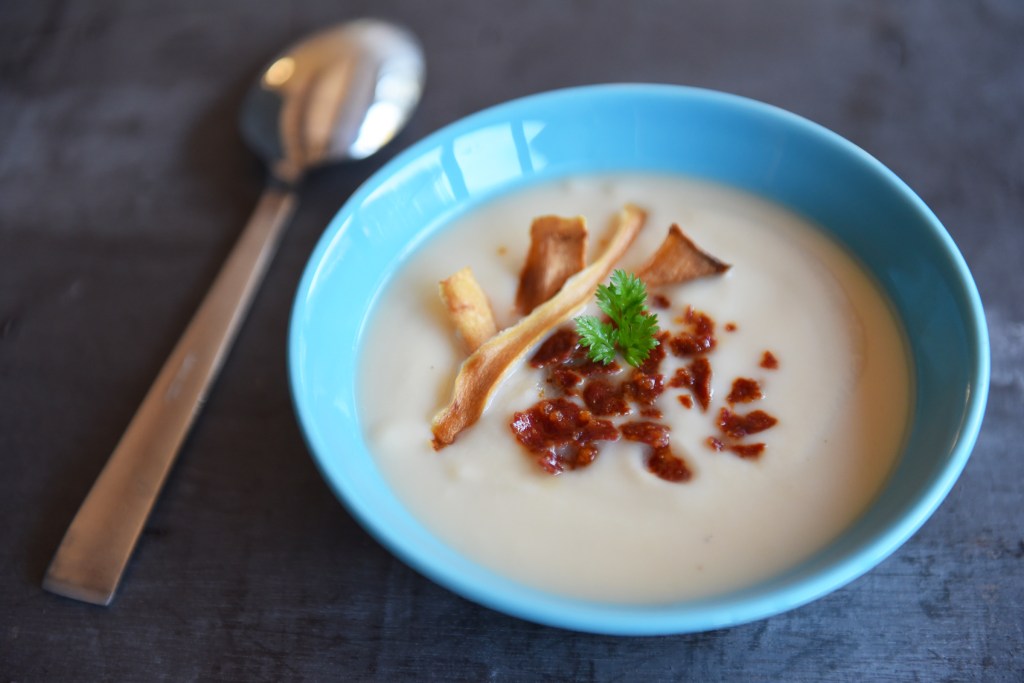 Pastinaak is een prachtige groente om soep mee te maken. Heel romig en vol van smaak. Voor een feestelijke versie werk je de met fijngesnipperde gerookte eendenborst. Geserveerd in kleine kopjes is het een perfecte amuse. Wil je het graag wintershartig, werk dan af met krokant gebakken spekjes of zoals in het recept een crumble van chorizo.