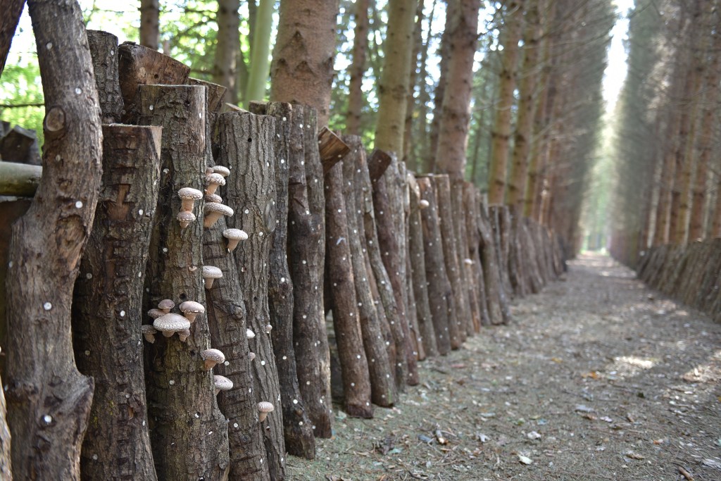Er zijn 2 manieren om shii-take te telen, op substraat en op houten stammetjes. Telen op substraat vraagt een omgeving met een constante temperatuur en vochtigheid. Bovendien wordt er een massa plastic gebruikt. Alles bij mekaar geeft dit een negatieve impact op de ecologische voetafdruk. Telen op hout geeft de beste smaak aan de paddenstoel en is ecologisch verantwoord. Wij gebruiken hout uit de diepe Ardennen, dat gekapt wordt bij de uitdunning van bossen. Dit “afvalhout” wordt meestal verhakselt of gebruikt als brandhout, maar is de ideale voedingsbodem voor de shii-take.