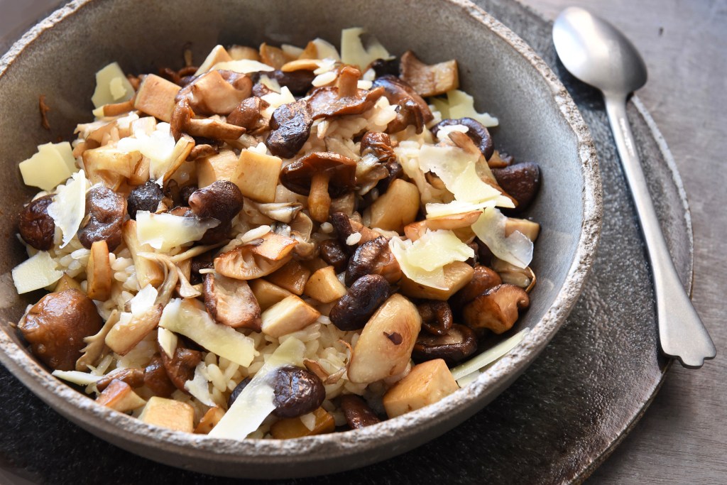 – Doe alle paddenstoelen terug in de pan, zet het vuur nog even hoog, voeg een klontje boter toe en meng goed door de paddenstoelen. Breng op smaak met peper en fleur de sel. – Doe de risotto over in een warme schaal, meng er de helft van de paddenstoelen door en verdeel de rest erover. Werk af met schilfers parmezaan of pecorino
