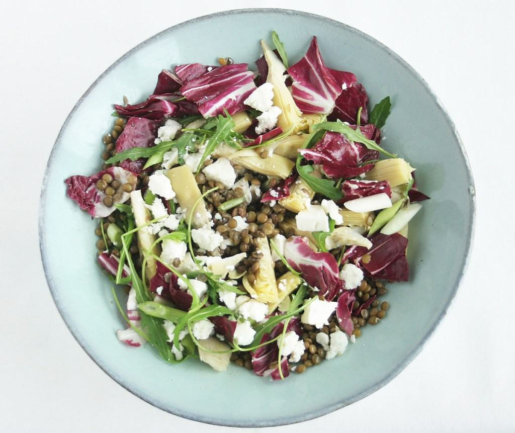 Meng er voorzichtig artisjokken, ui, feta en blaadjes rucola en reepjes radicchio door.