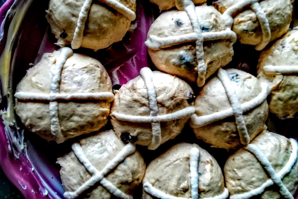 De kleine ronde bollen zijn een variant op onze rozijnenbroodjes of krentenbollen. De naam komt van de afwerking bovenop namelijk een kruis gemaakt van water en bloem verwijzend naar het kruis waaraan Christus stierf. Oorspronkelijk werden de hot cross buns gebakken door de monikken op Goede Vrijdag en uitgedeeld aan de armen. Bijgeloof wil dat als je een hot cross bun aan een touwtje gedurende een jaar in de keuken laat hangen, je beschermd bent tegen brand en alle broden die je bakt perfect uit de oven komen. Wie weet.
