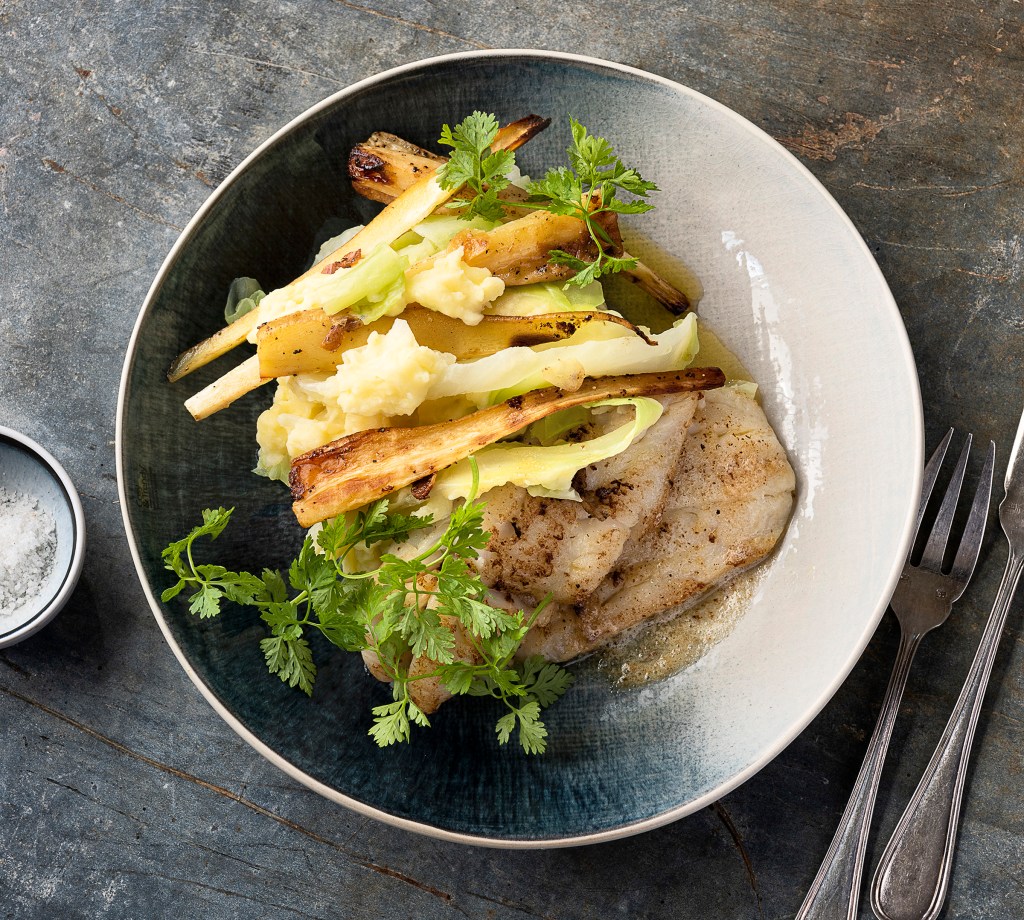 Schep een portie van de stoemp in het midden van het bord. Leg er de gebakken vis op, afwisselend met de geroosterde pastinaak. Lepel er nog wat bakboter over en werk af met enkele takjes kervel.