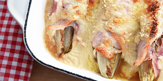 Leg de plakjes ham open, verdeel er het witloof over en rol de plakjes op. Leg in een ovenschaal, overgiet met de saus en bestrooi met de rest van de kaas. Plaats onder de grill tot er een mooi korstje is gevormd. Serveer met gekookte aardappelen of rijst.