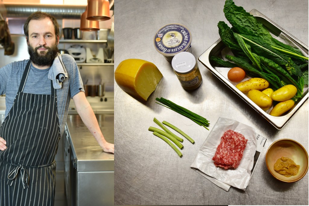 – Verdeel de puree over de borden, leg er de gehaktballetjes op, dek af met de gebakken palmkool en rasp er wat kaas over.