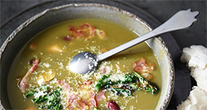 – Omdat ik steeds (bio)blikbonen (ik vind blikken gewoon handiger) gebruik warm ik ze op in hun sap, giet ze af en voeg ze dan als de soep gloeiendheet is toe samen met het spek, de worstjes en de gebakken boerenkool.