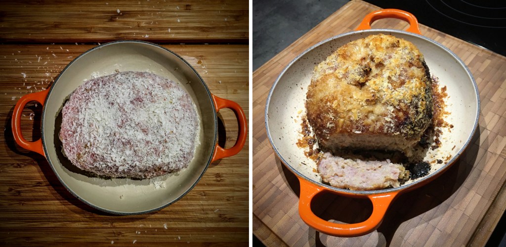 Tot zover het vlees, nu nog het brood. Of beter broodkruim en het mag uiteraard ook panko zijn. Met je handen goed nat vorm je van het gehakt een mooi ‘broodje’ dat je rondom in broodkruim inpakt. Zo gaat het in een bakje in de oven. Eenmaal gebakken laat je het een nachtje afkoelen. De dag erna kun je er lekker van smullen samen met kriekjes of appelmoes en gebakken patatjes!”