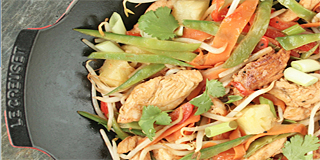Verhit 1 el olie in een wok of diepe braadpan en kleur de kippenreepjes op hoog vuur rondomrond. Verminder het vuur, giet er de marinade in en laat ca. 10 min. zachtjes sudderen. Voeg de geblancheerde groenten toe samen met de uitjes, taugé en stukjes ananas, schep om, doe er tamari en mirin in en laat alles goed doorwarmen. Werk af met de verse koriander.