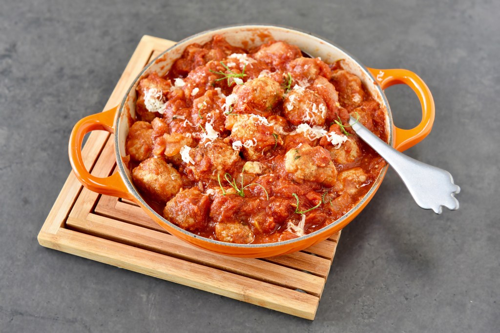 – De ballekes kun je heel klassiek eten met aardappelpuree, maar je kunt ze ook een zuiderse toets geven door aan de saus paprika’s toe te voegen en er pasta bij te geven. Werk dan af met verse basilicumblaadjes en parmezaanschilfers.