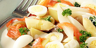 Leg de asperges in diepe borden en verdeel er de eitjes, aardappeltjes en zalm over. Besprenkel met de vinaigrette en werk af met peterselie.