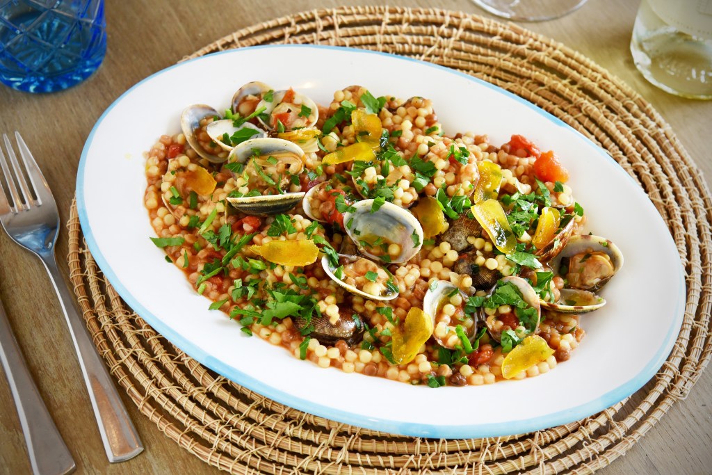 – Fregola is de typische pastasoort van Sardinië. Het deeg van griesmeel van harde tarwe, water en een beetje zout, wordt in een grote terracotta kom gerold en gewreven (fregare) tot kleine onregelmatige bolletjes die in een oven worden geroosterd. Hier vind je enkel de gedroogde versie die men soms – heel onterecht – parelcouscous noemt.