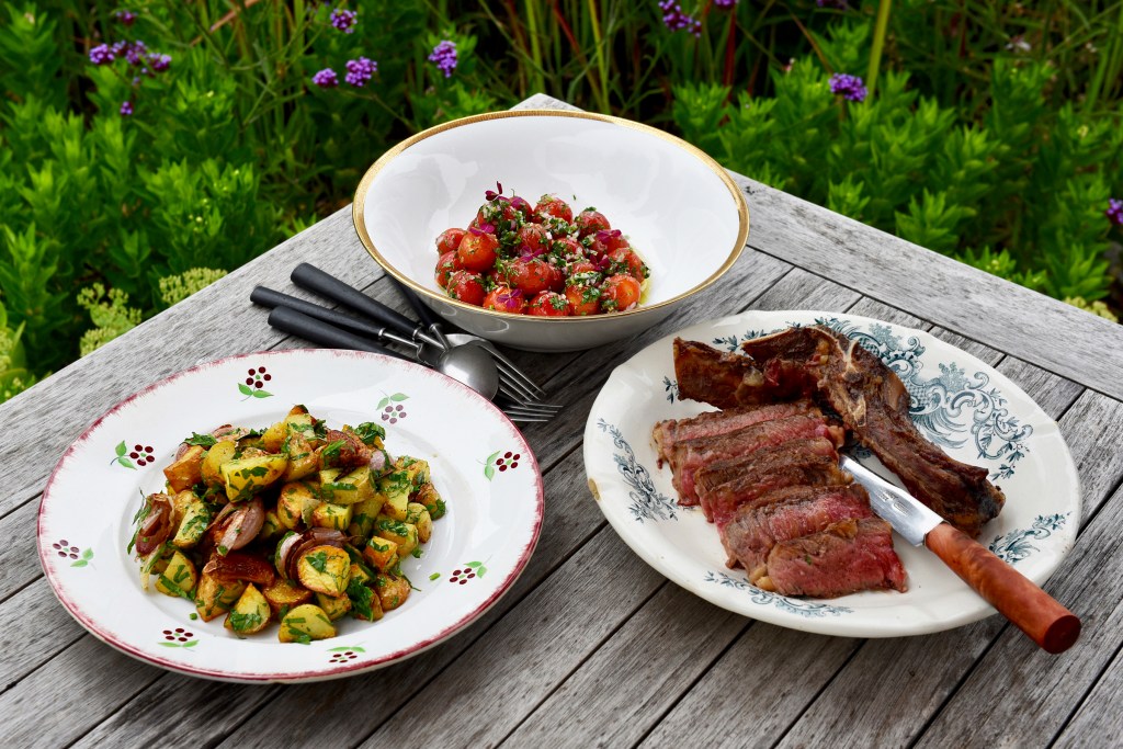 Bak voor de aardappelsalade de aardappels samen met de look aan in een flinke scheut olie. Bestrooi met Maldonzout en laat rustig verder garen in de oven bedekt met aluminiumfolie. Of typisch Braziliaans: doe over in aluminuiumfolie, vouw dicht en laat verder garen tussen de kolen van de BBQ.