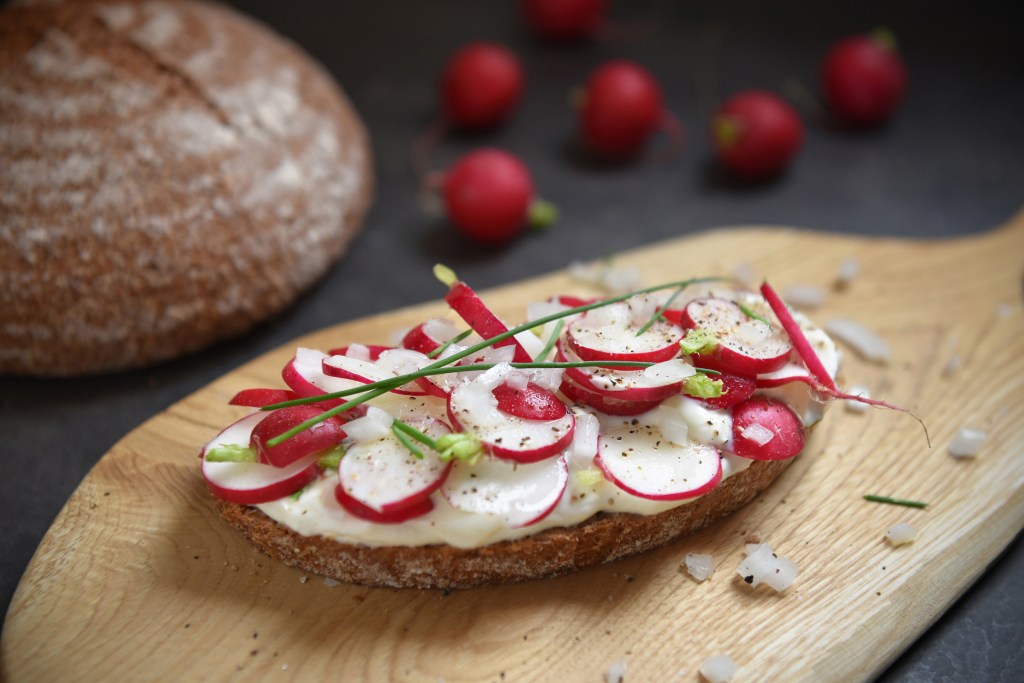 Boterham met platte kaas, radijs, lenteui en bieslook (4 pers.)
