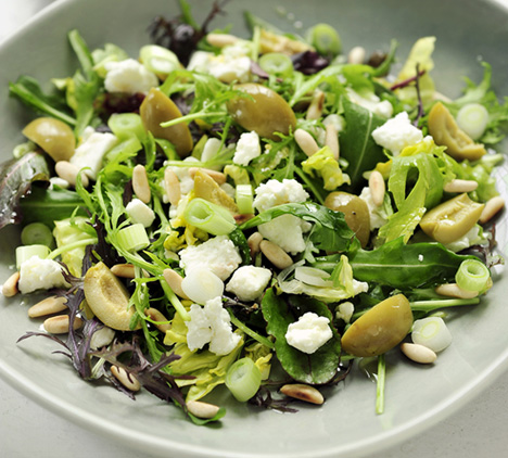 Verkruimel de feta en verdeel samen met de olijven en lente-uitjes over de sla. Besprenkel met de dressing.
