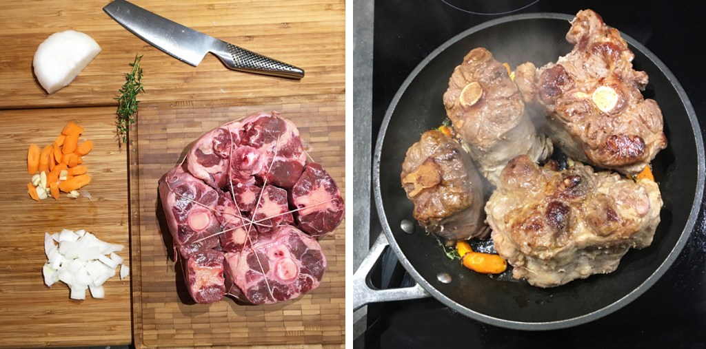 – Spoel de staartstukken, dep ze goed droog, kruid met peper en zout, doe ze bij de groenten en kleur ze mooi rondomrond. Doe over in een stoofpot, voeg de rest van de groenten toe samen met wijn, water en kruiden. Laat ca. 4 uur onder deksel sudderen op een laag vuurtje.*